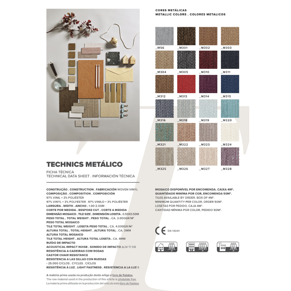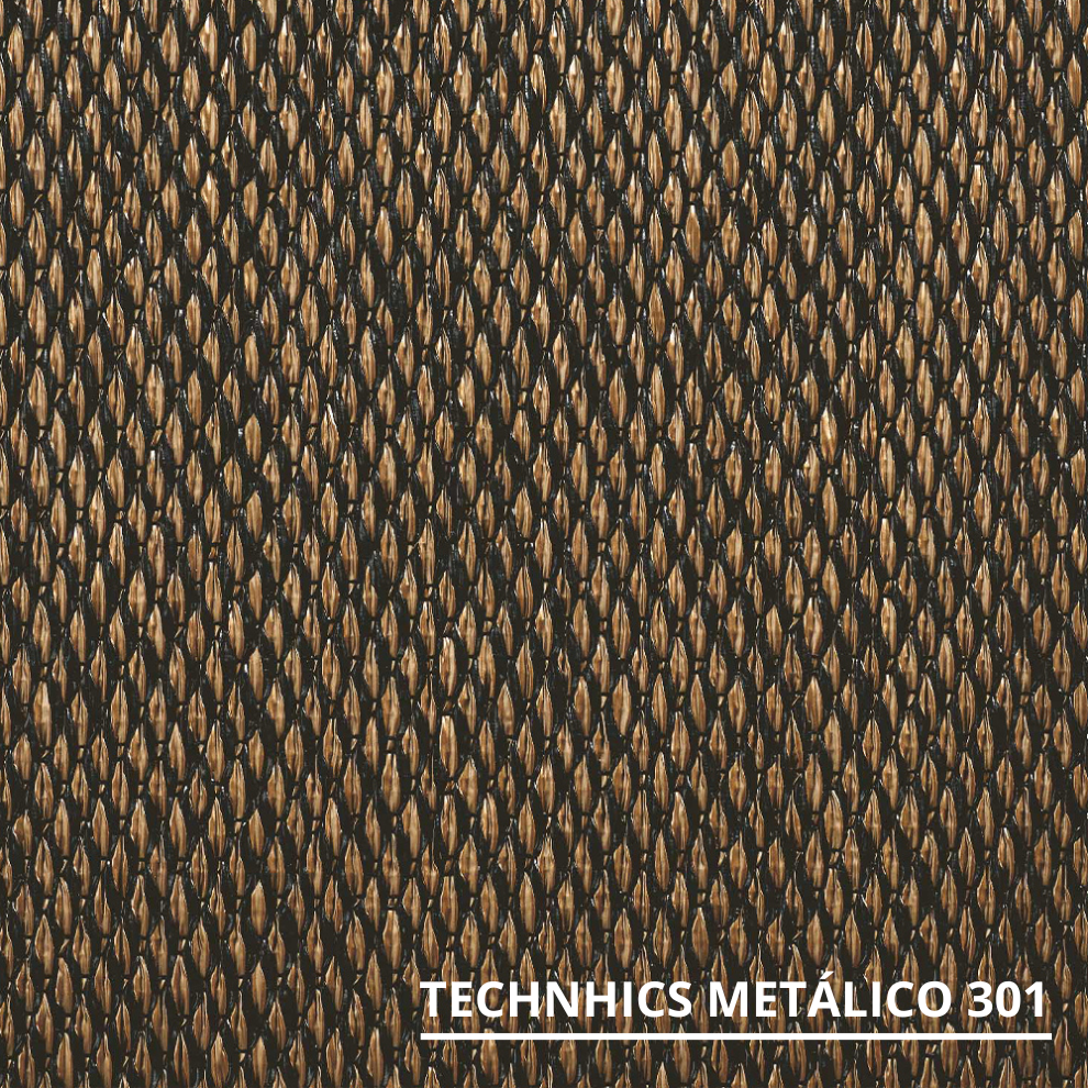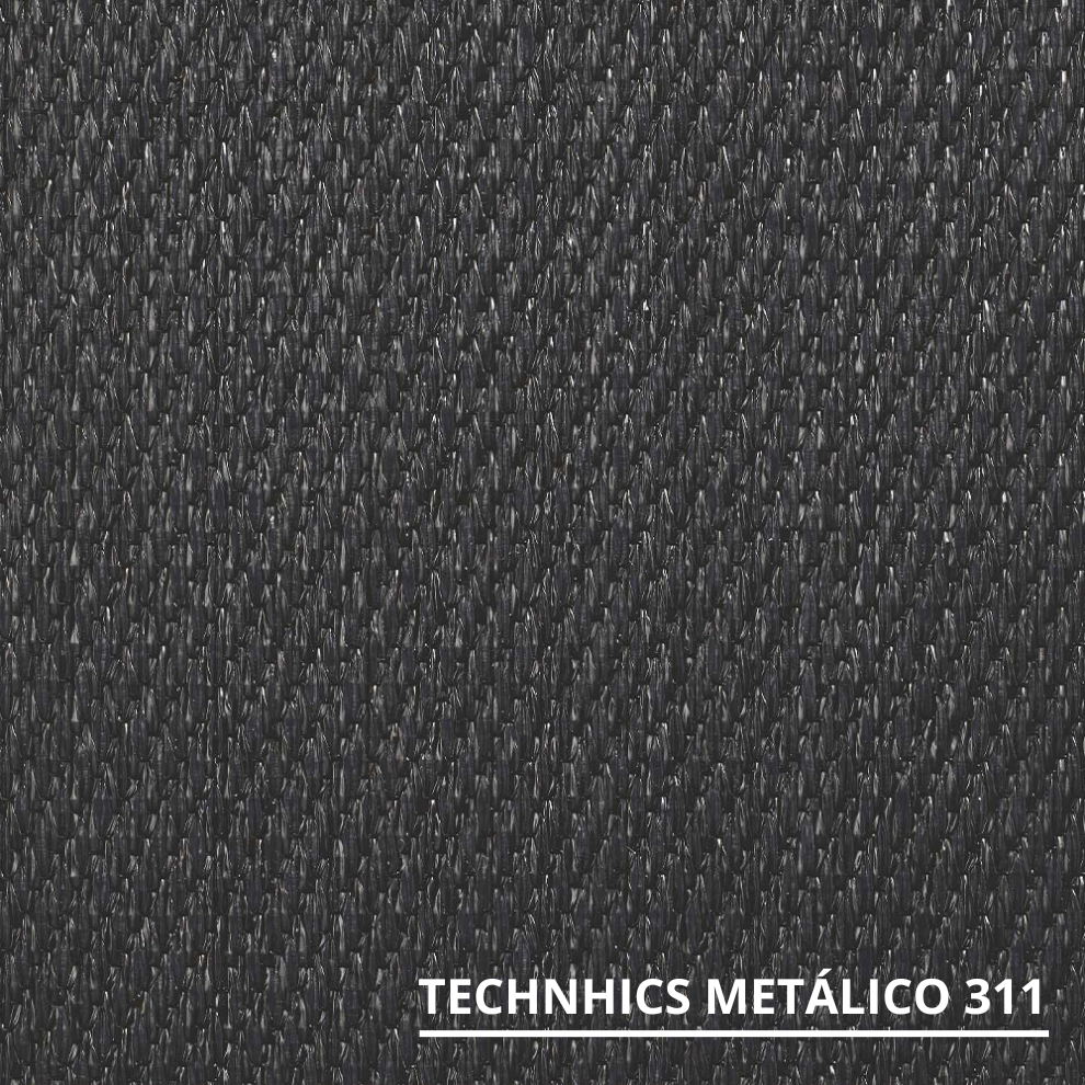 A Carpete Technics Metálico tem um revestimento de piso versátil, disponível em vinil entrançado, oferecendo também opções em rolo e mosaico.